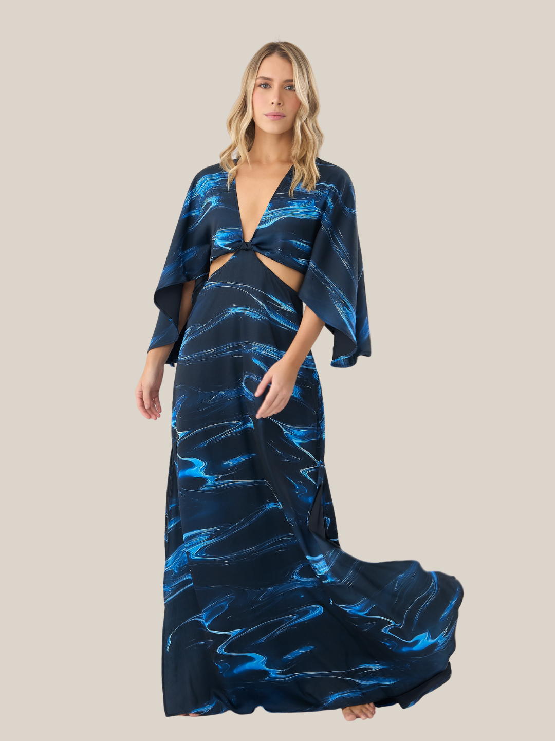 • El estampado ondulado en azul profundo recuerda la energía del océano bajo la luz del atardecer, creando una pieza que no pasa desapercibida.