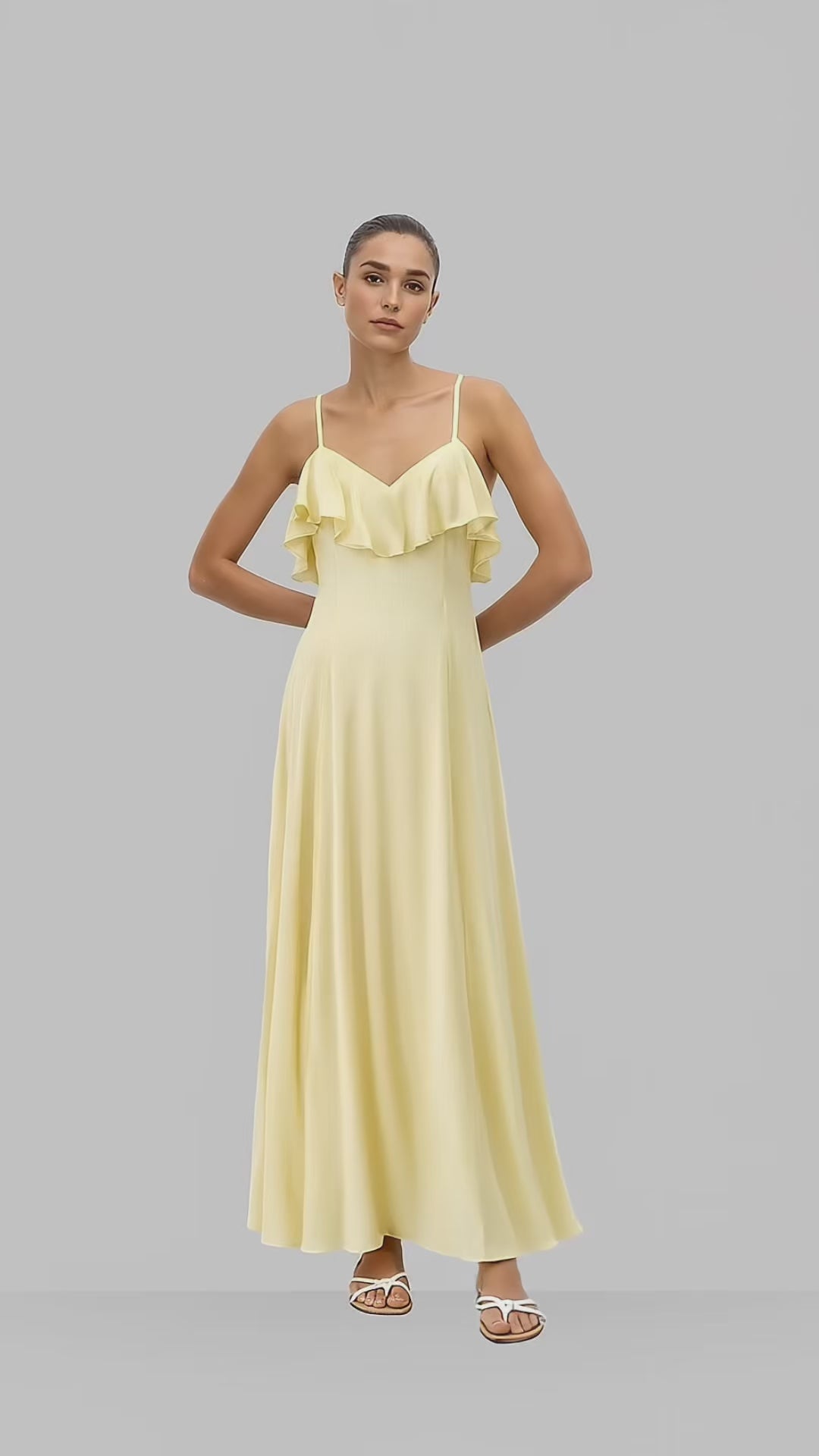 En amarillo luminoso y volantes sutiles, celebra la feminidad que fluye sin imponerse.