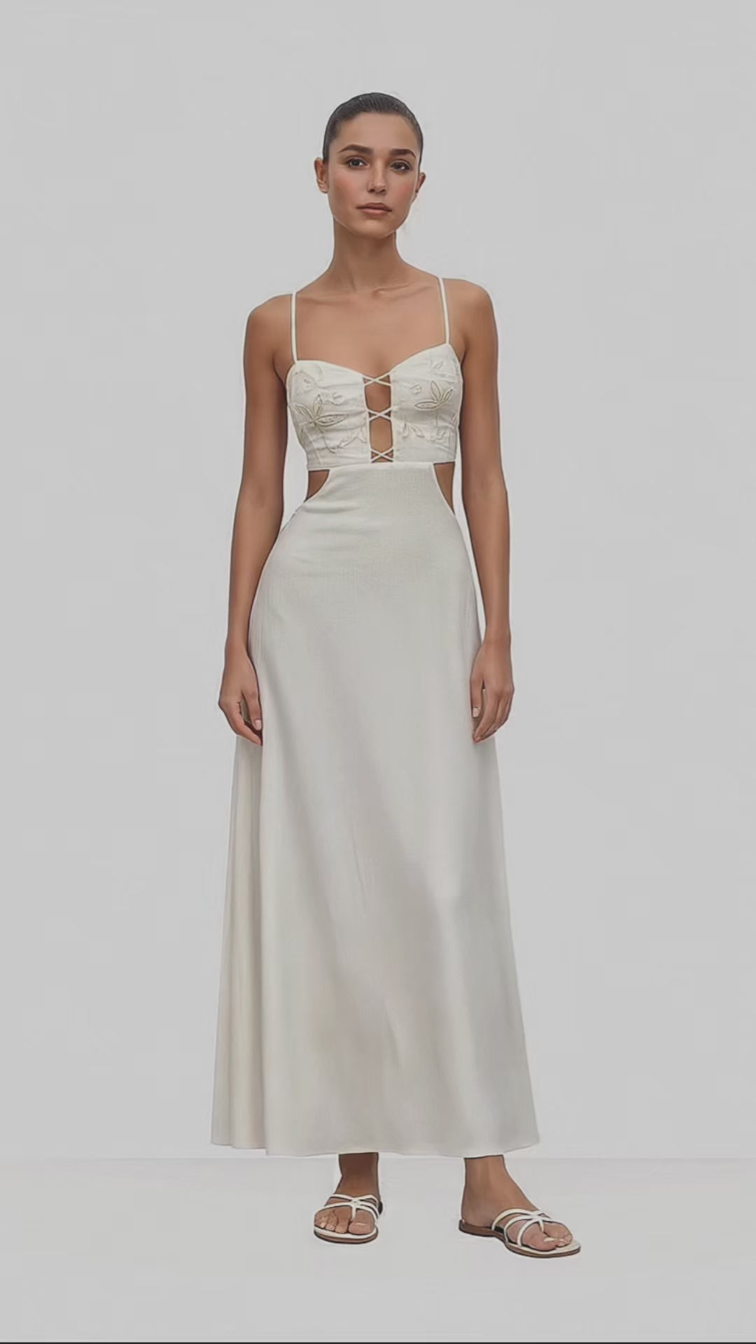 Bordado frontal y falda de textura suave, sensualidad sutil y sofisticación atemporal.