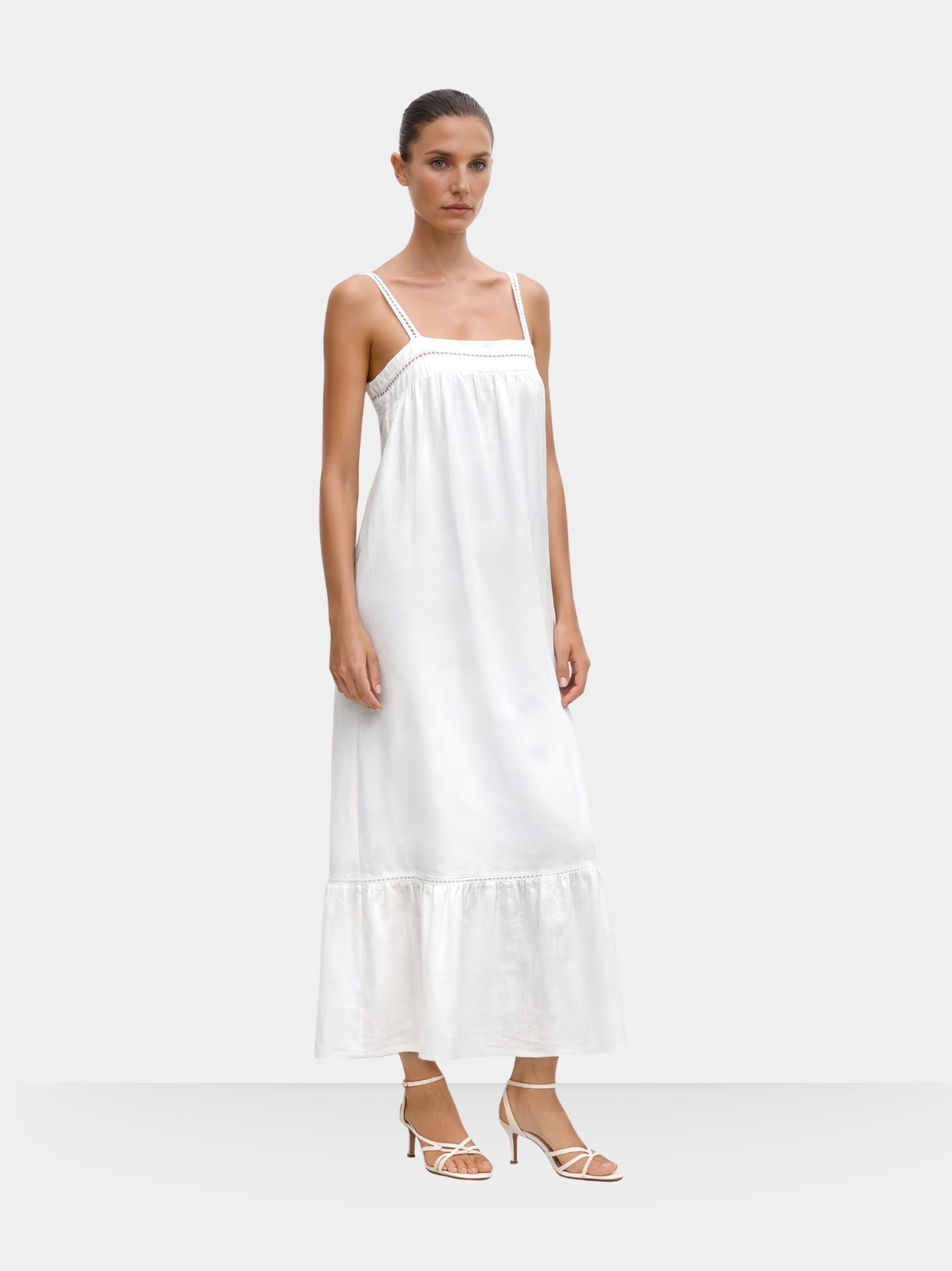 Escote recto con detalle de guipure en busto y cargaderas con acabado interno delicado.