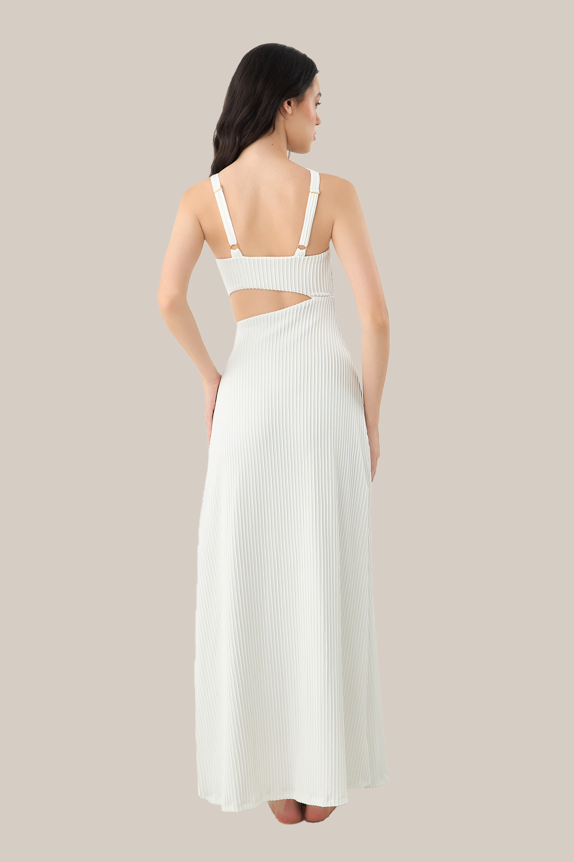 - Un vestido largo y etéreo que equilibra lo sensual con lo esencial.